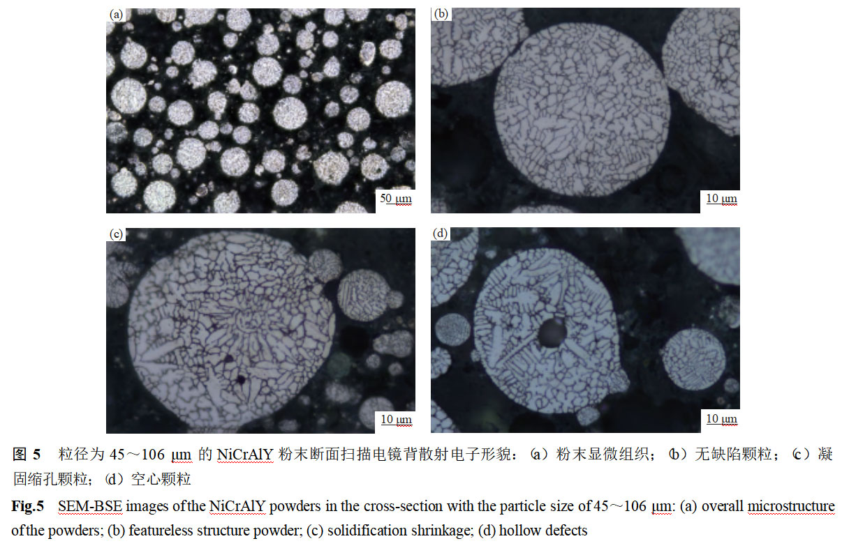图5是NiCrAlY粉末(45~106μm)断面的扫描电镜背散射(scanningelectronmicroscope-backscatteredelectron,SEM-BSE)形貌。从图5(a)可知,组织整体均匀致密,具有缩孔或空心缺陷的粉末数量占比约为8%~10%。观察单个放大颗粒发现[12],截面直径<50μm粉末内部结构致密,未观察到明显的冶金缺陷,如图5(b)所示。部分截面直径>50μm的粉末内出现不规则的凝固缩孔,大粒径颗粒内甚至出现多处缩孔,如图5(c)所示。这是因为冷凝过程中小尺寸熔滴冷速快、过冷度大,促进内部大量形核,晶粒之间相互接触而抑制晶粒长大。大尺寸熔滴冷速慢、凝固时间长,易形成树枝晶组织。凝固缩孔是由于熔滴冷凝收缩形成的,当大粒径颗粒内形成多个树枝晶,冷凝收缩程度更大,易形成多处缩孔[13]。