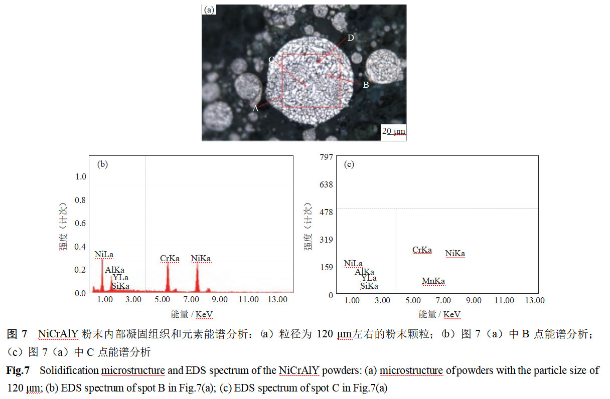 NiCrAlY合金主元素Ni、Cr、Al的熔点、原子半径、密度差距明显,熔滴冷凝过程中趋向发生选择性凝固,形成树枝晶组织,所以小粒径粉末内也出现明显的枝晶组织。随熔滴增大,冷速降低,大粒径粉末趋向形成树枝晶组织。但是大熔滴内不同部位与环境之间热交换较为复杂,情况各异。因此,图4的大粒径粉末内才会出现细化胞状晶和枝状晶的混合组织,甚至出现二次枝晶。
