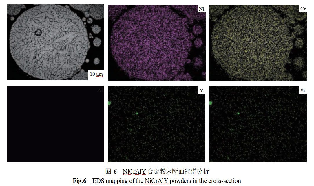 图6是NiCrAlY合金粉末断面的能谱(energydispersespectroscope,EDS)面扫描分析。从图6可以看出,主要元素Ni、Cr、Al均匀分布,没有明显的富集和贫化现象,而微合金化元素Y、Si则分布不均匀。主要元素均匀分布是由于熔融液滴雾化过程中处于103~104K·s−1冷速下,粉末内部元素来不及聚集,就已快速凝固所致。