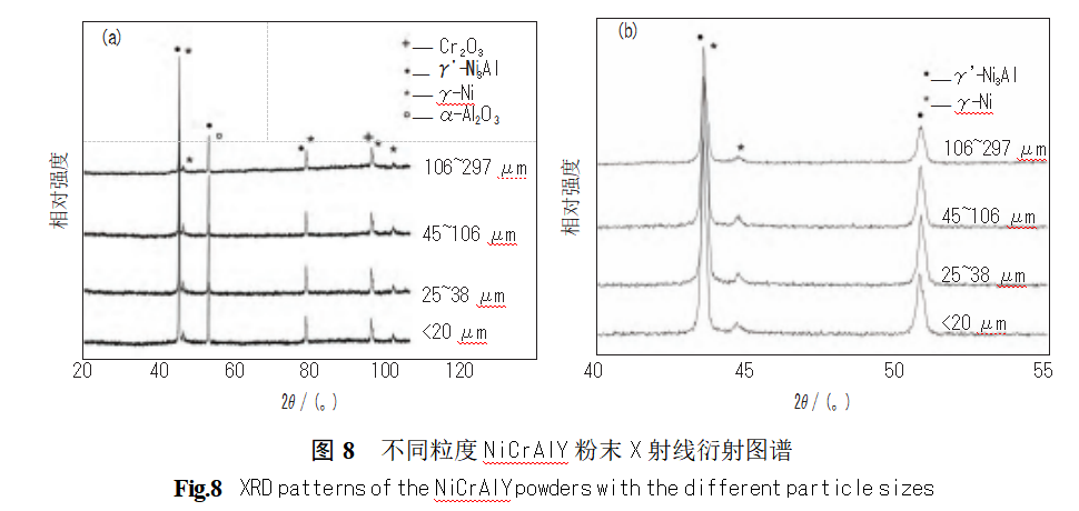 (4)粉末相组成主要为γ'-Ni3Al和γ-Ni,且晶格畸变程度随粒度变小而加重。