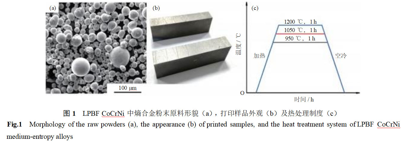 LPBFCoCrNi中熵合金用3D打印粉末原料为球形CoCrNi合金粉末,主要化学成分(质量分数)为Co33.23%、Cr33.14%、Ni33.42%,粉末形貌如图1(a)所示,平均粒径约为20μm。金属3D打印机激光功率和扫描速度分别为195W和850mm/s,激光宽度0.10mm,层厚0.03mm,打印在氩气保护下完成,样品尺寸为20mm×10mm×10mm,如图1(b)所示。采用排水法得到LPBFCoCrNi中熵合金相对密度为99.94%,通过400倍光学显微镜观察未发现明显的制造缺陷。LPBF CoCrNi中熵合金主要成分为(质量分数):Co33.8700%,Cr32.1400%,Ni33.6500%,C0.0054%,O0.0200%,N0.0060%,Si0.0450%,Cu0.0120%,Al0.0270%。为消除内应力并均匀化微观结构,分别在氩气环境中900、1050和1200℃下进行1h热处理(空冷),热处理制度如图1(c)所示。