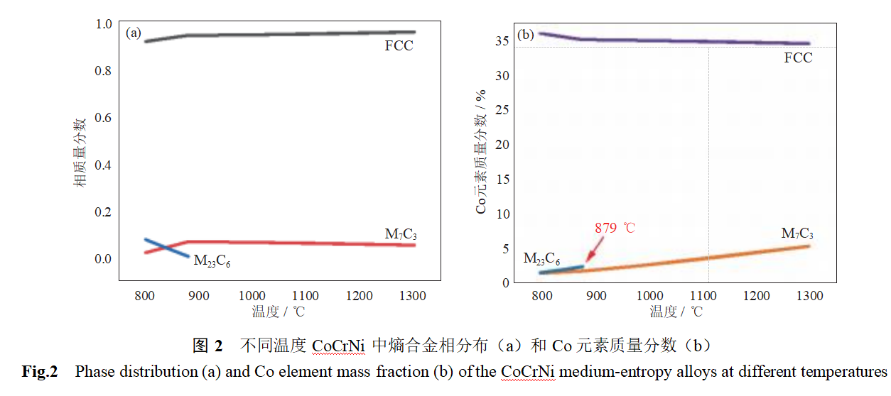 图2为Thermo-calc计算的CoCrNi中熵合金相组成及含量变化。由图可知,该合金主要为面心立方(face-centeredcubic,FCC)单相固溶体。当温度低于879℃时,合金中含有少量碳化物析出相,主要为M23C6和M7C3;当温度高于879℃时,M23C6消失,第二相主要为M7C3。