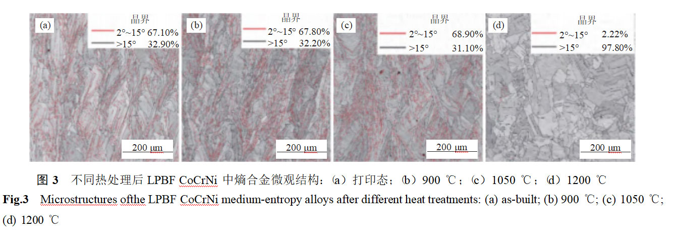 图3展示了不同热处理后LPBFCoCrNi中熵合金的微观结构。由图可知,打印后样品可见明显的熔池结构,且熔池界面处的晶界角度较大。随着固溶处理温度从900℃升高到1050℃,熔池特征逐渐减弱,大角度晶界比例降低。当固溶温度达到1200℃时,熔池结构完全消失,样品中出现明显的等轴晶结构,并且在晶粒内部可见明显的孪晶结构。这主要归因于高温条件下微观结构的回复和再结晶过程[13–14]。