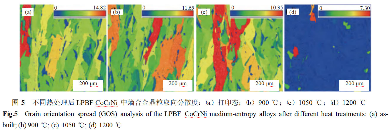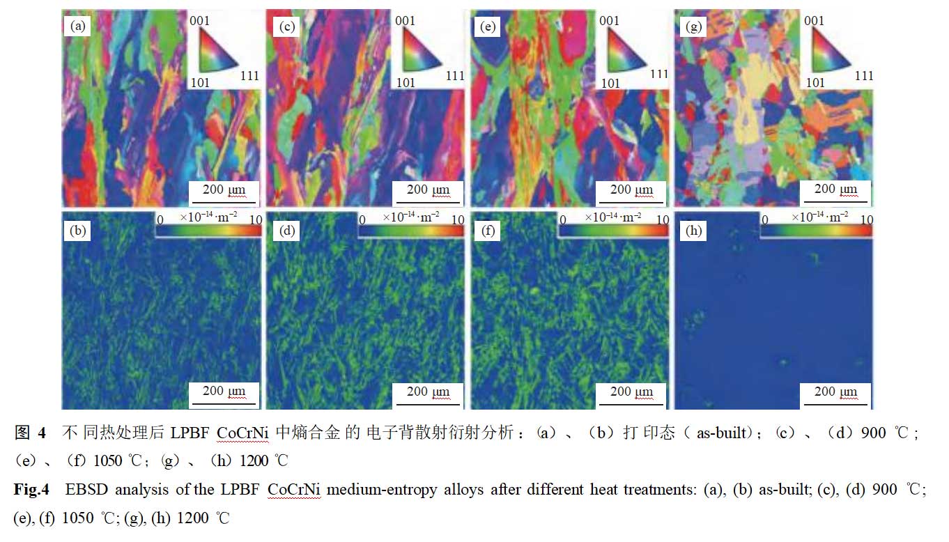 图4展示了不同热处理后LPBFCoCrNi中熵合金的电子背散射衍射结果。打印态样品中可见明显的柱状晶结构,这主要归因于打印过程中熔池内较大的温度梯度,未发现明显的晶粒取向,在熔池界面和晶界处存在显著的应力集中(位错富集)。随着固溶温度从900℃升高到1050℃,柱状晶结构仍然存在,且未观察到明显的回复过程,晶粒存在明显的择优取向(图5(b)~(c))。当热处理温度上升至1200℃时,柱状晶结构转变为等轴晶结构,晶界处未发现明显的位错富集,此时试样发生回复再结晶,晶粒内并无明显的择优取向(图5(d))。