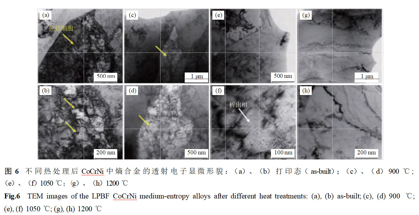 (1)打印后CoCrNi合金具有明显的柱状晶组织和位错胞状结构,随着热护理温度由900℃提高至1200℃,位错胞状结构逐渐消失,柱状晶逐渐转变为等轴晶,发生回复再结晶,晶粒尺寸减小,第二相析出逐渐粗化。