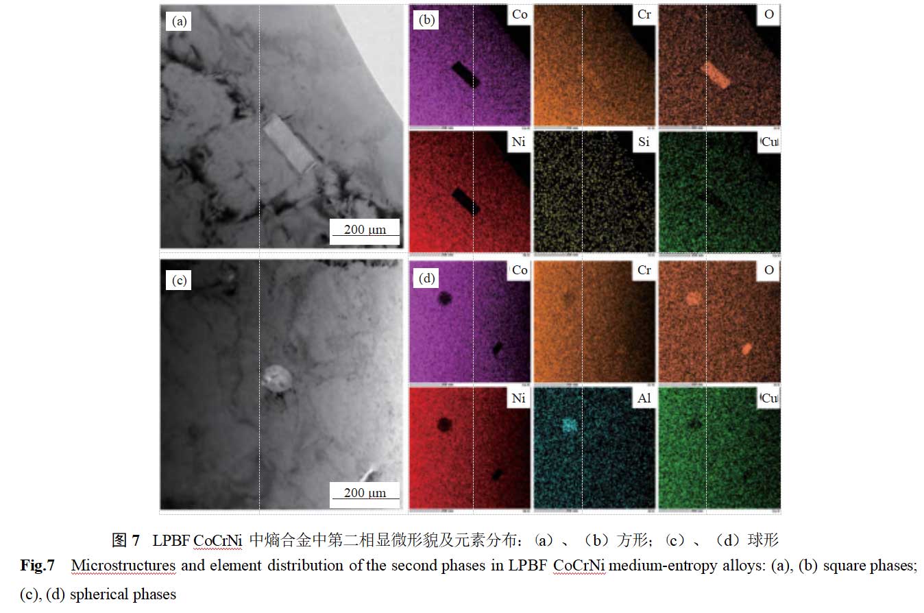 图7展示了LPBFCoCrNi中熵合金中第二相的形貌和元素分布。微观结构中存在两种不同形貌的微纳米第二相。根据能谱分析,方形第二相尺寸约为200nm,主要由氧化铬组成;球形第二相尺寸约为100nm,主要由氧化铝组成。第二相中较高含量的氧化物主要归因于球形粉末中的氧杂质以及在增材制造过程中由于保护气氛不足而引入的氧气[17–18]。