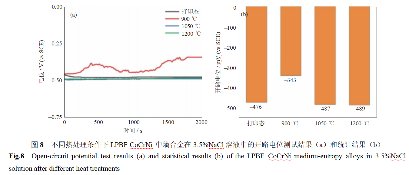 图8为不同热处理条件下LPBFCoCrNi中熵合金在3.5%NaCl溶液中的开路电位。由图可知,3D打印后CoCrNi中熵合金在3.5%NaCl溶液中开路电位为–476mVSCE,当经900℃热处理后,开路电位提高至–343mVSCE。这主要归因于热处理过程中位错迁移及残余应力释放,导致材料局部均匀性提高;同时,高密度的胞状位错壁通过增加电子活性扩散来加速表面反应动力学,胞状位错壁表面电位较高,促进钝化膜成膜,耐蚀性能较好[19–20]。随着热处理温度提高至1050℃和1200℃,开路电位逐渐降低至–487~–489mVSCE,这主要归因于胞状位错结构消失,导致位错胞壁元素富集消失,难以促进钝化膜快速成膜,耐蚀性能下降。