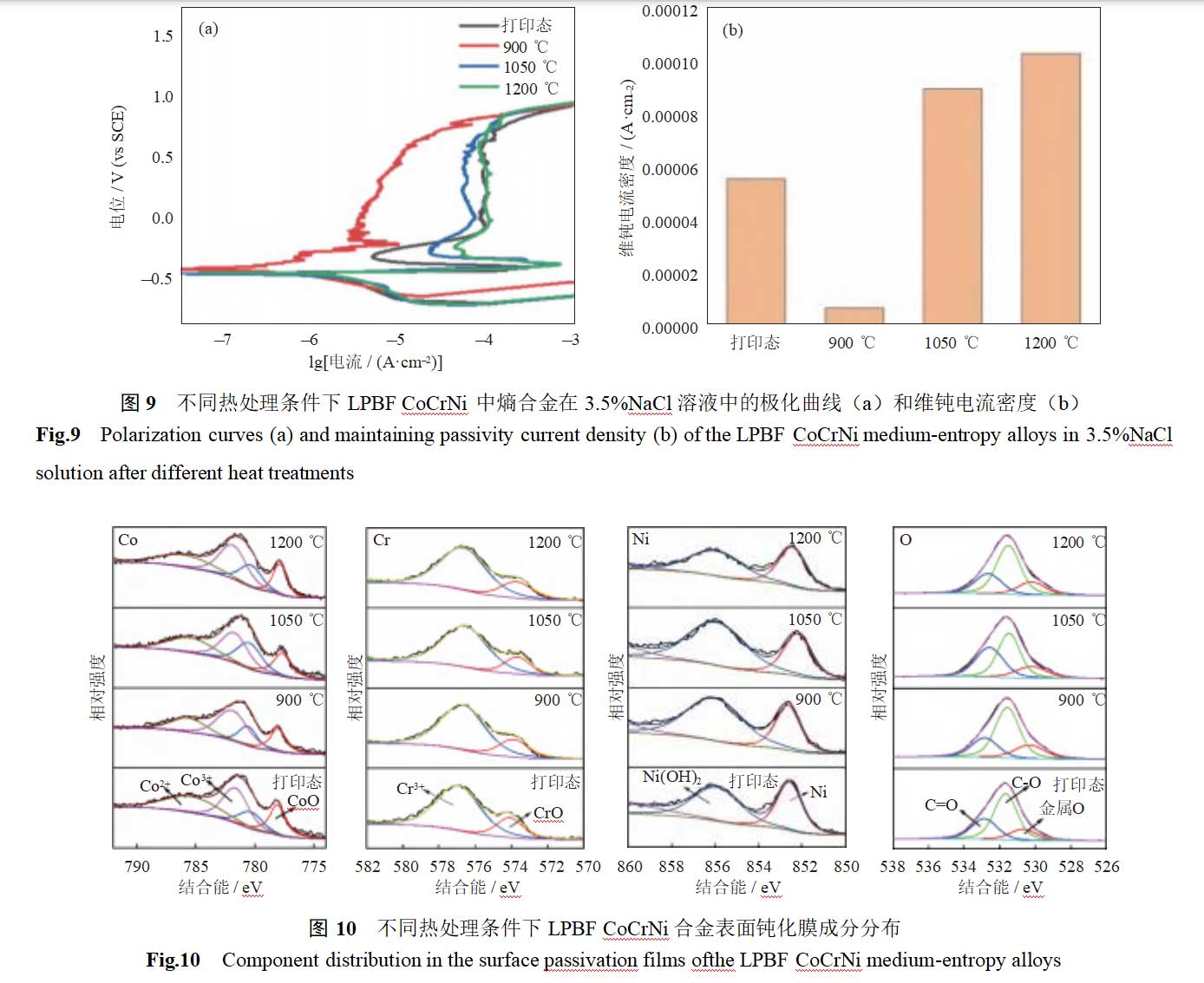 通过X射线光电子能谱测量不同热处理条件下LPBFCoCrNi合金表面形成的钝化膜成分。样品在空气中放置30d以形成钝化膜,测试时使用55eV的通能。所有峰通过XPSPEAK软件拟合,并以标准峰(C1s,284.8eV)进行校正。