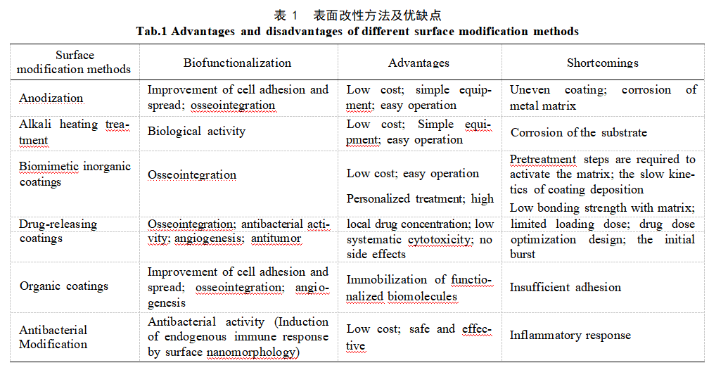 生物材料的表面特性直接影响生物相容性和组织整合能力。材料表面的形貌、粗糙度、化学成分、电荷密度对材料–细胞相互作用产生影响,进而改善骨–种植体界面的结合质量,促进植入体的初期稳定性[12-13]。目前针对多孔Ta的表面改性方法主要有碱热处理、阳极氧化、仿生无机涂层、有机涂层、缓释给药涂层和抗菌涂层,表1总结了AM多孔钽的各种表面改性方法及其优缺点[14-21]。