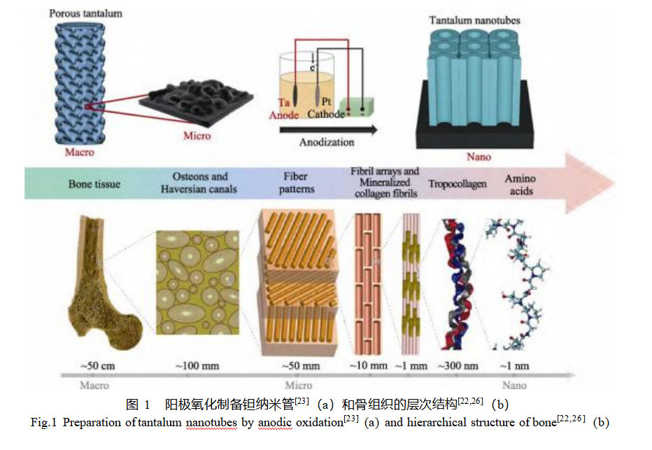 骨具有从宏观到纳米层次水平的分层结构(图1a),主要由较软的胶原蛋白和较硬的磷灰石矿物组成,因此骨骼兼具一定的强度和韧性,是一种可以承载大载荷的轻质材料[22]。理想的骨科植入物应具有与人骨组织相似的微观结构和力学环境,模拟天然骨成为开发新型骨组织工程支架材料的关键策略。为此,多数研究通过控制阳极氧化工艺参数如电压、电解液成分、温度、电流等,对多孔Ta表面形貌进行修饰,以获得类似于人体骨骼的微/纳多孔层。Zhang等[23]采用选区激光熔融(SLM)技术制备了微梯度多孔Ta支架,并通过阳极氧化在多孔Ta表面制备出Ta纳米管(图1b),实验结果表明:多孔Ta的微/纳分层结构在体外和体内均有促进成骨的效果。小鼠胚胎前成骨细胞(MC3T3–E1)的丝状伪足可以进入Ta纳米管并形成连锁单元结构,与未经阳极氧化的多孔Ta组相比,成骨标记基因上调约3~4倍。植入兔股骨7周后,相较于对照组,其早期骨整合性能显著增强。此外,另一项研究[24]也表明,相比单纯的微孔Ta,在微孔Ta表面制备Ta2O5纳米管能够促进人骨髓间充质干细胞的黏附和增殖,成骨基因水平上调1.5~2.1倍。Ta2O5纳米管也可以在无酸电解液中形成,Fialho等[25]在无HF电解液(乙二醇、水、氟化铵)中,通过一步阳极氧化法制备出规则有序的Ta2O5多孔表面,但其物理和生物特性是否比利用含HF电解质制备的氧化层更具优势还需进一步研究。从生物力学角度来看,纳米多孔表面可以有效调节细胞的生长和取向;从物理仿生的角度来看,这些Ta2O5纳米管阵列的表面结构模仿了天然骨组织复杂的几何形状,为细胞的生长提供了多孔网状结构。在未来的临床应用中,具有仿生微/纳梯度结构的3D打印多孔Ta在改善种植体骨整合方面具有很好的应用前景。