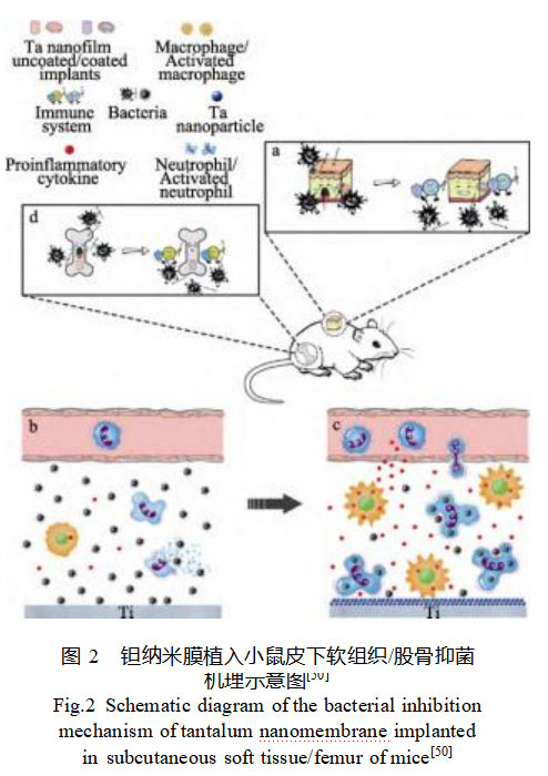 Ta纳米膜已被证实能通过内源性免疫调节而具有抗菌活性和抑制骨溶解的作用,其抗菌机理如图2所示[50]。Ta纳米膜可增强嗜中性粒细胞对细菌的吞噬作用,减少中性粒细胞的溶解,促进巨噬细胞释放促炎细胞因子。这种免疫调节作用有助于宿主消灭细菌,与传统通过毒性作用杀死细菌的抗菌涂层相比更加安全有效。利用AM技术直接制备功能–结构一体化的纳米形貌表面多孔Ta骨科植入物是一种简单、经济的潜在抗菌策略。