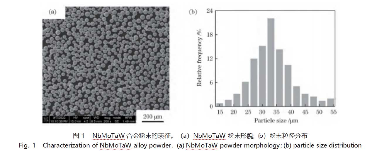 试验设备采用配有Nd∶YAG光纤激光器的3D打印机,最大功率为500W。试验所用粉末为Nb、Mo、Ta、W和Ti粉末以及粒径为~500nm的WC预合金粉末,质量分数为99.9%。粉末主要为球形颗粒,如图1(a)所示,粉末粒径为15~53μm,如图1(b)所示。采用行星球磨机机械混合12h,然后将粉末置于120℃的真空箱中保温4h以去除粉末中的水分,提高粉末的流动性。