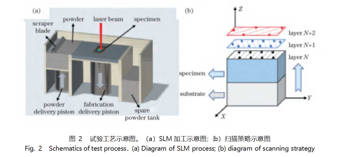 在SLM成形过程中,向成形舱内通入高纯度氩气,保证打印过程中成形舱内含氧量(体积分数)低于4×10-4,保护样品不被氧化。利用钨板作为基材,钨板由粉末冶金工艺制成,厚度为8mm,表面积为30mm×30mm。为了减小加工过程中产生的残余应力,将钨基板预热至180℃[26],图2(a)为简化的SLM加工示意图。通过多次正交试验确定最优的SLM工艺参数,以制备表面成形好、无宏观裂纹等缺陷的试样。在扫描过程中,每层成形后,扫描路径旋转67°,如图2(b)所示,其中XYZ为空间坐标系,XY为基板平面,Z为打印方向,N为打印层数。如此反复直到试样完全成形,最终,采用SLM直接成形了尺寸为8mm×8mm×5mm的块体试样和直径为2mm、高度为4mm的圆柱形压缩试样。