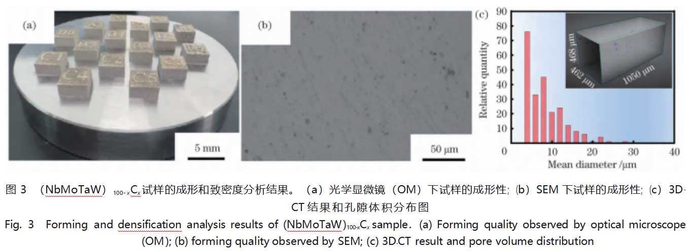 在垂直于打印方向的平面上拍摄了(NbMoTaW)100-xCx(x%=0,0.5%)RHEA的宏观形貌,并利用3D-CT检测了样品的相对致密度,如图3所示。宏观形貌和3D-CT结果显示,试样中没有裂纹,只有少量尺寸(小于23µm)较小的孔隙,如图3(b)所示。3D-CT结果显示,(NbMoTaW)99.5C0.5RHEA的致密度为99.6%,表明(NbMoTaW)99.5C0.5具有良好的成形性。