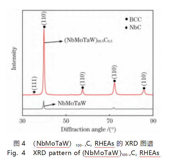 (NbMoTaW)100-xCxRHEA的XRD图谱如图4所示。可以看出,NbMoTaW合金为单相BCC结构,晶格常数为3.216Å;(NbMoTaW)99.5C0.5还包含有NbC相,晶格常数为4.428Å。
