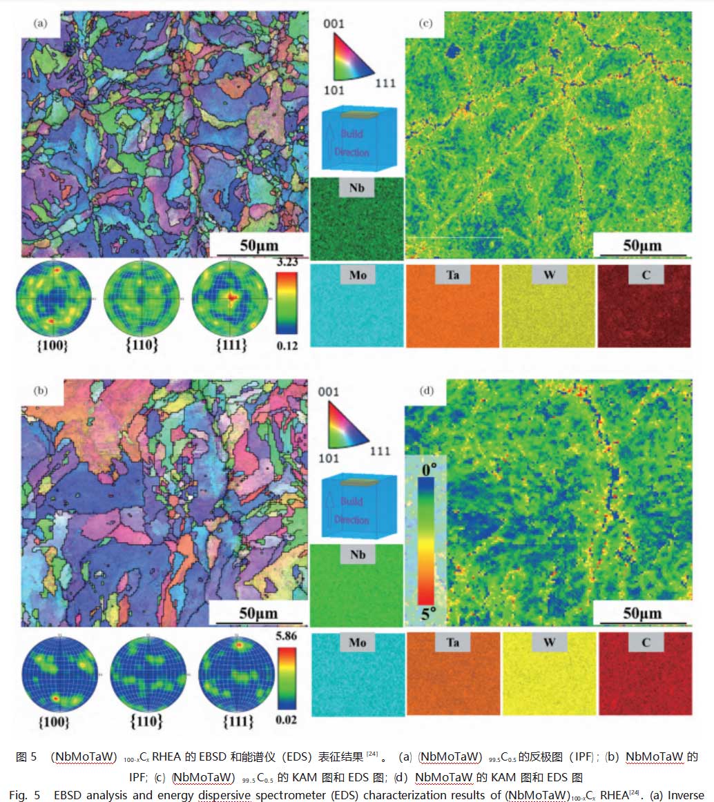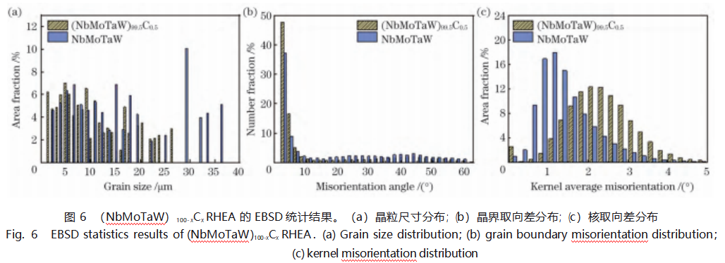 (NbMoTaW)100-xCxRHEA的EBSD结果如图5和图6所示。(NbMoTaW)100-xCxRHEA的微观组织由许多拉长的晶粒和少量等轴晶粒组成,如图5(a)、(b)所示。Nb、Mo、Ta和W元素在(NbMoTaW)99.5C0.5和NbMoTaW RHEA中几乎均匀分布,但在(NbMoTaW)99.5C0.5中有少量C原子的聚集。(NbMoTaW)100-xCxRHEA的晶界分布、晶粒尺寸、局部取向差的统计分析结果如图6所示。通常来说,角度为2°~15°的界面被认为是亚晶界,角度大于15°的界面被认为是晶界。如图6(a)、(b)所示,(NbMoTaW)99.5C0.5RHEA中有大量的亚晶界,约占73.6%(面积分数),平均晶粒尺寸为10.6μm;而NbMoTaW RHEA的亚晶界含量则为54.8%(面积分数),平均晶粒尺寸为18.4μm,表明C的微合金化有效地提高了亚晶界的含量,细化了晶粒尺寸。此外,(NbMoTaW)99.5C0.5RHEA表现出更高的几何必要位错(GND)的密度,如图5(c)、(d)所示。核(局部)平均取向差(KAM)的详细统计结果如图6(c)所示。(NbMoTaW)99.5C0.5RHEA的KAM平均值为2.3°,0°~1°的面积占比更小,约为4.6%;NbMoTaW RHEA的KAM平均值为1.4°,0°~1°的面积占比约为29.2%,表明C的微合金化有效提高了GND的密度。