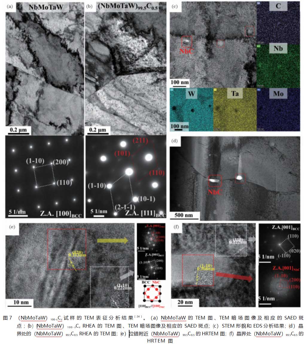 图7为(NbMoTaW)100-xCxRHEA的TEM图像。图7(a)、(b)显示,在(NbMoTaW)99.5C0.5RHEA中观察到大量弥散分布的析出相,其主要分布在晶界和位错处,如图7(d)所示,少量分布在晶粒内部。(NbMoTaW)99.5C0.5RHEA的选区电子衍射图(SAED)中含有一组不同于NbMoTaW的额外衍射斑点[图7(b)],在[111]BCC晶带轴[27]上,析出相的[110]和基体BCC相的[1-10]平行。利用高分辨TEM(HRTEM)和EDS对析出相进行分析,发现析出相为直径58nm的多边形颗粒,EDS结果显示析出相主要富含Nb和C元素,如图7(c)所示。在晶界处,析出相呈条状分布,长为90~110nm,宽为40~60nm[图7(d)]。为了确定析出相的具体成分,采用[001]BCC晶带轴上的HRTEM图像进一步表征了析出相的原子结构,如图7(e)所示。对基体区域和析出相进行傅里叶变换(FFT),证实析出相为NbC相,与XRD结果一致。其中[1-10]BCC和[020]NbC的面间距分别约为0.222nm和0.213nm,在[100]BCC晶带轴上,基体与NbC析出相之间存在[010]NbC∥[1-10]BCC的相位关系;[110]BCC和[1-10]NbC的面间距分别约为0.222nm和0.308nm,基体与NbC析出相之间存在[200]NbC∥[110]BCC的相位关系,如图7(f)所示。计算得到析出相的晶格参数为~0.417nm,与NbC晶格参数的理论值0.419nm非常接近。NbC析出相的弥散强化作用不仅提高了合金强度,其在位错和晶界处的钉扎效应也有助于(NbMoTaW)100-xCxRHEA晶粒的细化。