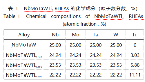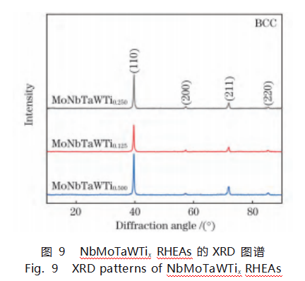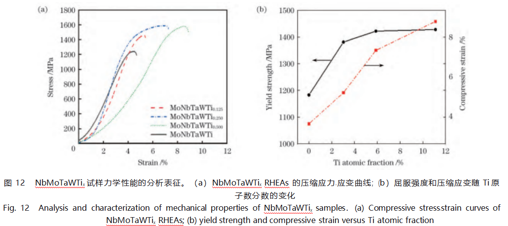 3)采用激光选区熔化技术制备了成形良好的NbMoTaWTix RHEAs。结果表明,NbMoTaWTix RHEAs均为单相BCC结构,随着Ti含量的增加,NbMoTaWTix RHEAs的晶格常数逐渐增大。Ti元素的加入可以有效提高NbMoTaW RHEA的强度和塑性,随着Ti含量的增加,NbMoTaWTix RHEAs的屈服强度、抗压强度和塑性均明显得到提高,分别提高了20.7%、30.7%和117.9%。