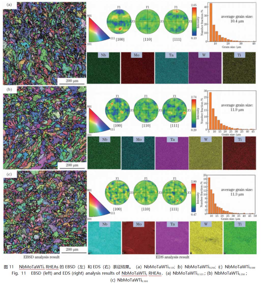 NbMoTaWTix RHEAs的EBSD结果如图11所示。NbMoTaWTix RHEAs的微观组织由部分细长晶粒和少量细小晶粒组成。且随着Ti含量的增加,NbMoTaWTix RHEAs{100}极图中强度大的区域占比越来越大,表明其[100]择优取向变显著。Nb、Mo、Ta、W和Ti元素在NbMoTaWTix RHEAs中几乎均匀分布,表明NbMoTaWTix RHEAs中的元素不存在宏观偏析,Ti原子均匀地固溶在基体NbMoTaW中,形成单相BCC结构。随着Ti含量的增加,NbMoTaWTix RHEAs的晶粒尺寸变化不大,晶粒尺寸变化对力学性能无明显影响,而Ti元素产生的固溶强化作用对其强度的提高起主要作用。