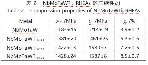 NbMoTaWTix RHEAs的压缩应力-应变曲线如图12(a)所示,相应的压缩性能参数如表2所示,其中σ0.2为屈服强度,σp为抗压强度,εp为应变。随着Ti含量的增加,NbMoTaWTix RHEAs的屈服强度、抗压强度和应变都明显提高。与NbMoTaW相比,NbMoTaWTi0.5RHEA的屈服强度、抗压强度和应变分别提高了20.7%、30.7%和117.9%。屈服强度和压缩率随Ti含量的变化如图12(b)所示。NbMoTaWTix RHEAs的屈服强度在添加少量Ti元素后迅速增大,随着Ti含量的增加,屈服强度的增大幅度逐渐减小;而NbMoTaWTix RHEAs的压缩应变则随Ti含量的增加呈近似线性增加。