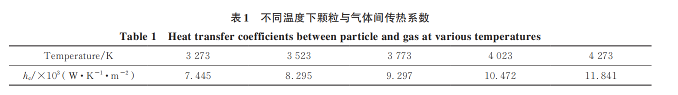 式中,T∞是环境温度,K;TP是气体颗粒温度,K;AP是颗粒的表面积,m2;hc是颗粒表面传热系数,W/(K·m2),传热系数主要受温度、材料成分、颗粒与气流相对运动速度等因素影响,计算过程中所用的不同温度下颗粒对流传热系数如表1所示;ε是发射率;σsb是Stefan-Boltzmann常数,5.67×10-8W/(m2·K4)。颗粒球化的气氛为氩气,对于氩气等单原子分子或者氢气等对称的双原子分子,气体对热量的吸收和辐射能力较弱,对流换热是气体与颗粒之间的主要换热方式,在计算过程中可忽略辐射换热项。