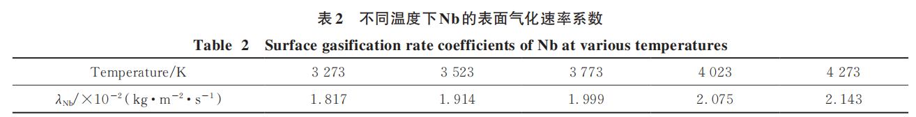 式中,mi为元素i的质量,kg;λi为单位时间单位面积元素i的气化速率系数,kg/(m2·s),气化速率系数主要受温度、材料成分等因素影响,计算过程中所用的不同温度下Nb的表面气化速率λNb如表2所示;ai为液滴表面元素i的活度,在Nb合金中Nb元素为基体材料,因此计算过程中其活度值取1。环境温度和液滴表面的温差对λi有明显影响,因此对元素损耗速率也有明显影响。通过求解以上微分方程可计算出液滴表面元素气化损耗的质量,进而获得气化损耗率。