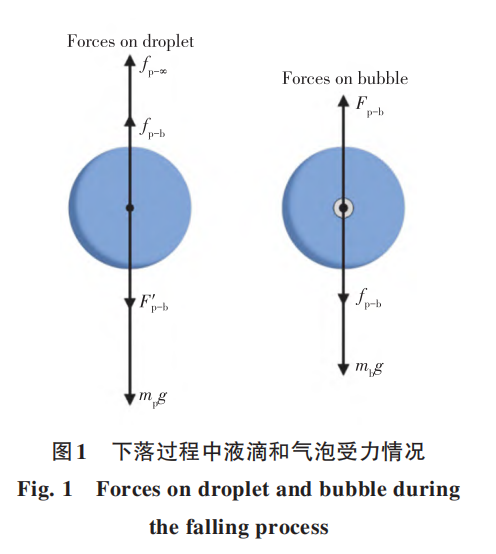 为简化模型,假设气泡位于颗粒中心,液滴状态持续时间用上一小节介绍方法计算。由于气泡的受力情况较为复杂,在该运动系统中,气泡受到重力(mbg)、浮力(i-,)、黏滞阻力(f'?-b),其加速度(ab)根据牛顿运动定律表示如下: