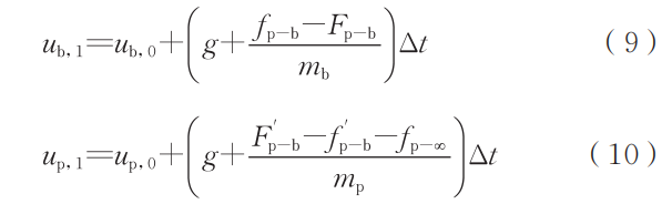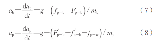 式中各种力的单位均为N。液滴受到重力(mpg)、空气阻力(fp-∞)、气泡浮力的反作用力(F'?-b)、气泡黏滞阻力的反作用力(f'?-b),其加速度(ap)根据牛顿运动定律表示如下: