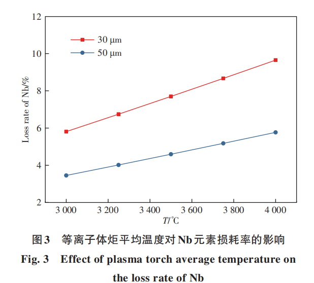通过理论计算对球化过程中Nb元素(考虑到铌合金以Nb元素为主)损耗率进行了计算,主要研究了等离子体炬平均温度和颗粒直径对Nb元素损耗的影响。计算中用到的气体流量、温区长度和平均温度是以Tekna公司生产制造的型号为TekSphero-80kW的感应等离子球化设备为基础,结合HOSSAIN、TONG、NAM等人的多篇关于感应等离子球化过程数值模拟的参考文献确[13-17]。球化腔室中气体平均流速为1.8m/s,TekSphero-80kW等离子球化设备中感应线圈区域长度约0.1m,文献中模拟结果显示:当线圈区域长度0.1m时,等离子射流外延高温区域长度约0.15m,因此高温区长度设定为0.25m。等离子炬形成的高温区平均温度很难通过实验进行测量,因此只能相关文献中关于球化过程的数值模拟结果来估计,模拟结果显示当感应等离子炬耦合功率为15~20kW时,高温区平均温度约4000~5000℃,而TekSphero-80kW感应等离子球化设备总功率为60~80kW时(这是球化生产常用功率范围),感应等离子炬耦合功率约为12~15kW,因此估计高温区平均温度为3000~4000℃。固相转变为气相的速率远小于液相转变为气相的速率,因此从颗粒开始熔化到再次凝固的阶段为元素气化的主要阶段。图3为等离子炬平均温度对Nb元素损耗率的影响。图3中包括颗粒直径为30μm和50μm的情况,可以看出Nb元素的损耗率随温度升高明显增大,3000℃下,30μm颗粒球化过程中Nb元素损耗率为6%左右,而在4000℃下Nb元素损耗率接近10%。
