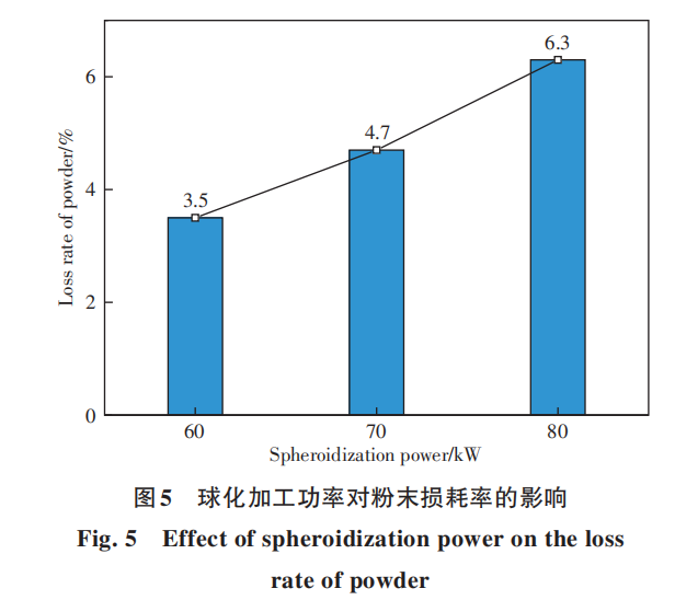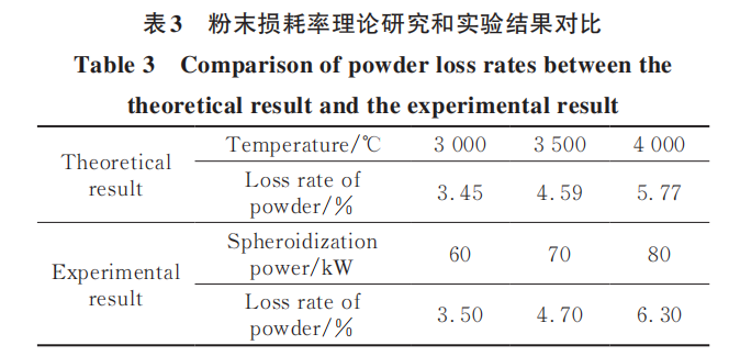 图5为Nb521合金球化过程中球化加工功率对粉末损耗的影响,该原料粉末粒径分布范围为30~50μm。粉末损耗率随功率增加而增加,60kW时粉末的损耗率只有3.5%,而80kW时损耗率为6.3%,球化功率增加时会使等离子炬内温度上升,加速液滴表面元素的气化挥发,理论计算结果也表明高温区温度增加时,元素损耗率有明显的提升。表3为粉末损耗率理论研究和实验结果对比,实验中球化功率为60~80kW,对应的高温区平均温度约为3000~4000℃,理论计算结果取粒径为50μm的结果(结果来自于图3),对比可看出损耗率在两种结果中的变化趋势保持一致,实验获得的损耗率稍高于理论计算值,可能是因为实验中粉末的粒度范围为30~50μm,平均粒径小于50μm,而通过之前的研究可知颗粒粒径减小时损耗率会提升,因此实验中损耗率较高,同时对比图3中的结果可知,实验中损耗率低于30μm时的计算结果。在实验和生产过程中,气化损耗的粉末在温度降低后重新凝结为固体粉末,由于这些粉末直径很小(小于5μm),因此随气流进入排气管道,这些细粉在随气流运动过程中,部分附着在球化腔内壁和管路内壁上,部分在气体过滤装置处与载气分离,也有部分附着在球化后粉末的表面。这些粉末因为粒度太小,不适合用于增材制造,可用于需要纳米级粉末的应用场景,或者回收后重新冶炼和制粉。因此,生产过程中在保证粉末球化率的前提下,加工功率不宜过大,需选用合适的球化功率,保证粉末球化率和收得率均在较高的水平。