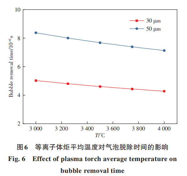 图6为等离子体炬平均温度对气泡脱除时间的影响,可以看出,气泡与液滴分离耗时非常小,耗费时间的数量级小于10-5s,在温度升高时,气泡脱除时间略微下降,主要原因是由于温度升高时金属液滴粘度下降,气泡更容易脱除。球化过程中颗粒以液态存在的时间数量级为10-1s,有充足的时间保证气泡从液滴里逸出。因此球化过程中保证尽可能多的颗粒熔化是提高气泡脱除的有效方式,提高球化温度、降低气流速度等均可以提高颗粒熔化的概率。