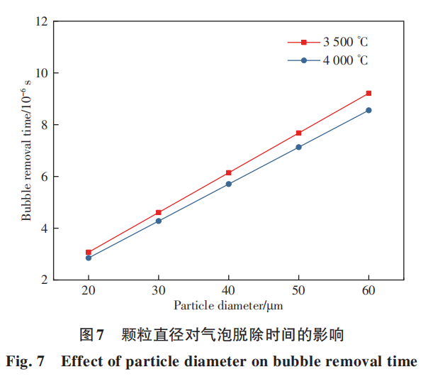 图7为颗粒直径对气泡脱除时间的影响,包括温度为3500和4000℃下的情况。可见颗粒直径增加时气泡脱除时间明显增加,两者基本呈线性关系。颗粒直径增加时,气泡与液滴表面平均距离增加,气泡需要运动更长的距离才能到达液滴表面,从液滴中逸出耗时也相应的增加。虽然粒径减小有利于气泡的脱除,但由上一节研究可知粒径减小时合金损耗率提升,且气泡脱除过程耗时非常短,大颗粒在熔化后脱气时间也很充足,因此没有必要为了提高气泡脱除率选用粒径更小的粉末。