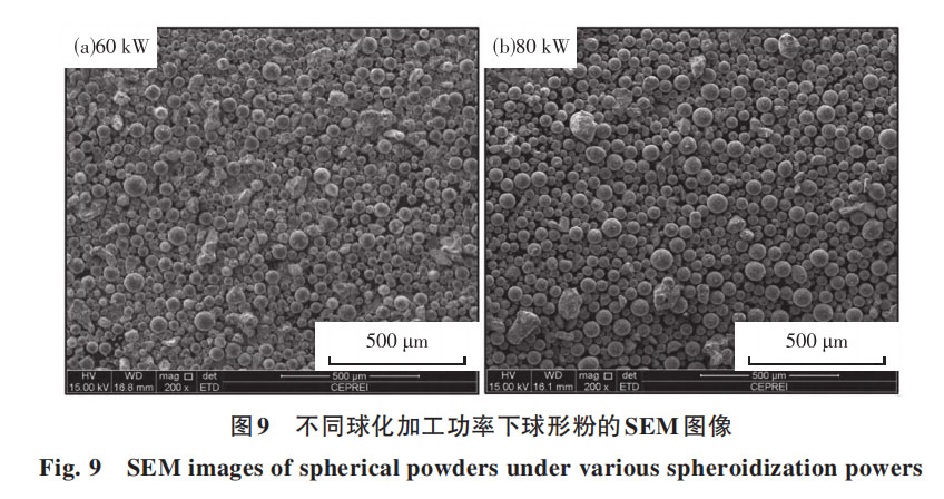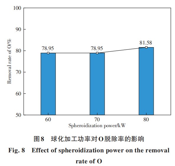 气泡与液滴分离过程是O、N等气相元素脱除的关键环节,该分离过程与脱氧有强相关性,通常,颗粒以液滴形式存在的时间越长,气泡与液滴分离耗时越短,则越有利于脱氧。然后,通过实验研究了球化生产过程中O的变化情况。图8为Nb521合金球化过程中O脱除率的情况,可见球化过程有明显的脱氧作用,球化功率为60kW和70kW时,O从初始的0.038%降低为0.008%(可能两种条件下氧含量有细微的区别,但检测结果精度只能达到0.001%),脱氧率约79%,80kW时O从初始的0.038%降低为0.007%,脱氧率稍微提升,达到81.58%,增加球化功率可略微增加O脱除率。由前面理论计算结果可知,气泡与液滴分离耗时相对较短,只要颗粒可以熔化,就有较充足的时间完成气泡的脱除,因此,保证颗粒熔化是提高脱O率的关键。图9为加工功率为60kW和80kW获得球形粉的SEM图像,可见80kW下的不规则粉末更少,球化率稍高于60kW下的球化率,说明球化功率提升时有更多的粉末颗粒熔化为小液滴完成了球化,因此,80kW下O的脱除率也稍高于60kW。此外,气泡与液滴分离过程是O、N等气相元素脱除的关键环节,该分离过程与脱氧有强相关性,通常,颗粒以液滴形式存在的时间越长,气泡与液滴分离耗时越短,则越有利于脱氧。然后,通过实验研究了球化生产过程中O的变化情况。图8为Nb521合金球化过程中O脱除率的情况,可见球化过程有明显的脱氧作用,球化功率为60kW和70kW时,O从初始的0.038%降低为0.008%(可能两种条件下氧含量有细微的区别,但检测结果精度只能达到0.001%),脱氧率约79%,80kW时O从初始的0.038%降低为0.007%,脱氧率稍微提升,达到81.58%,增加球化功率可略微增加O脱除率。由前面理论计算结果可知,气泡与液滴分离耗时相对较短,只要颗粒可以熔化,就有较充足的时间完成气泡的脱除,因此,保证颗粒熔化是提高脱O率的关键。图9为加工功率为60kW和80kW获得球形粉的SEM图像,可见80kW下的不规则粉末更少,球化率稍高于60kW下的球化率,说明球化功率提升时有更多的粉末颗粒熔化为小液滴完成了球化,因此,80kW下O的脱除率也稍高于60kW。此外,剩余部分的氧无法通过提高功率进一步脱除,一个原因是球化过程中少部分大颗粒难熔化,限制了O的脱除,另一个原因是O原本以氧化物的形式存在于合金中,而颗粒熔化为液滴的时间很短,在该时间段内,部分氧化物无法完成分解,这部分O无法析出并团聚形成气泡,无法以气泡的形式与液滴分离,最后残留在粉末中。