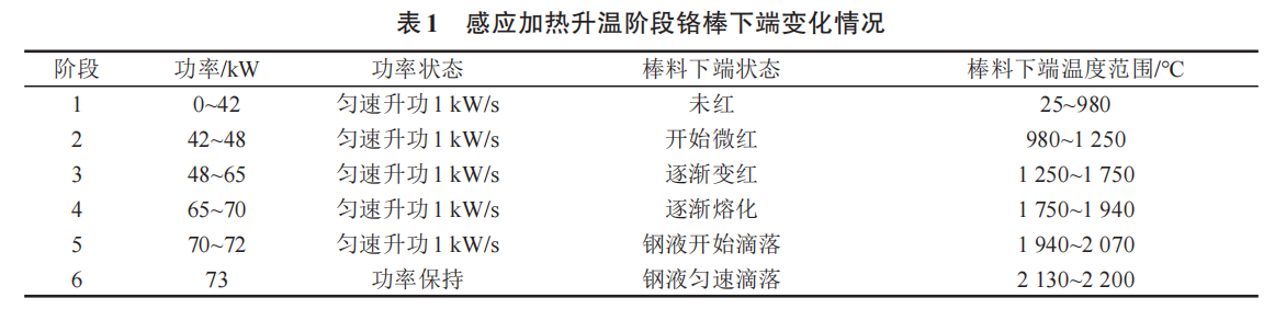 改进型电极感应熔炼气雾化制粉设备制备球形铬粉时,当加热功率达到73kW,能顺利将实验铬棒熔化,铬棒下端熔化速率能保证雾化制粉正常运行,设备稳定正常运行,感应加热提升功率阶段铬棒下端的变化情况见表1。