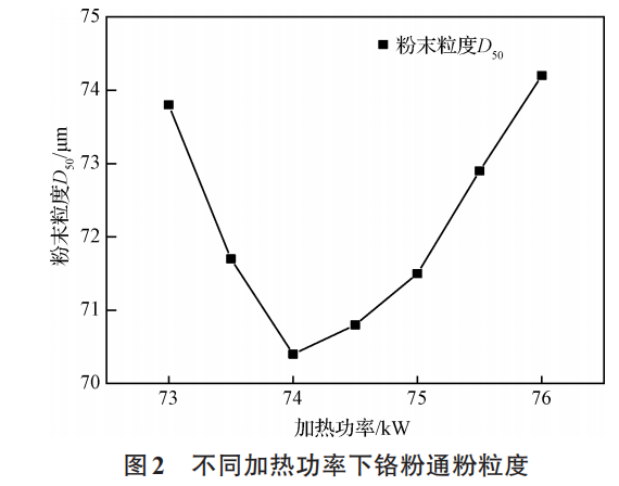 实验研究了雾化压力4MPa下不同加热功率对铬粉通粉(雾化制备的原始粉末,未经过任何处理)粒度的影响,如图2所示。