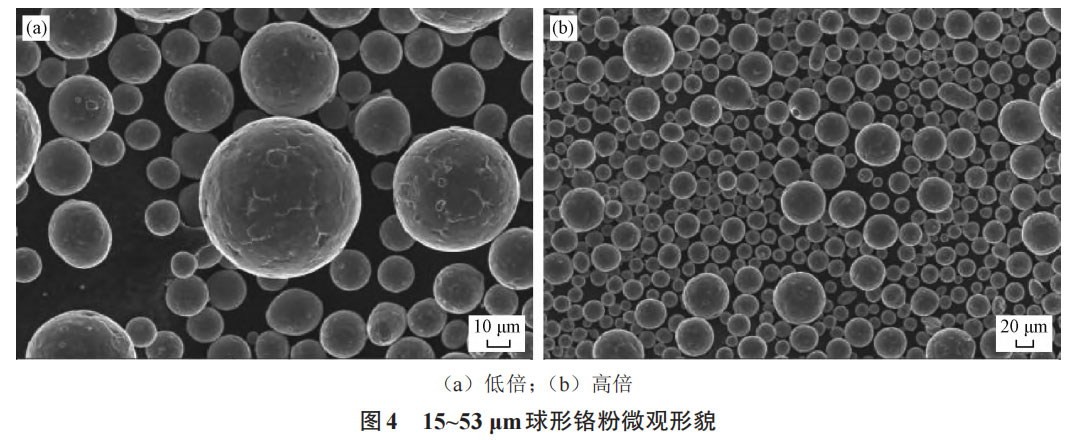 改进型电极感应气雾化制备的15~53μm球形铬粉微观形貌见图4所示,由图4可知,绝大部分粉体颗粒呈球形或类球形,无非金属夹杂,球化率大于98%,说明改进型EIGA法制备的球形铬粉纯净度高、球形度好。