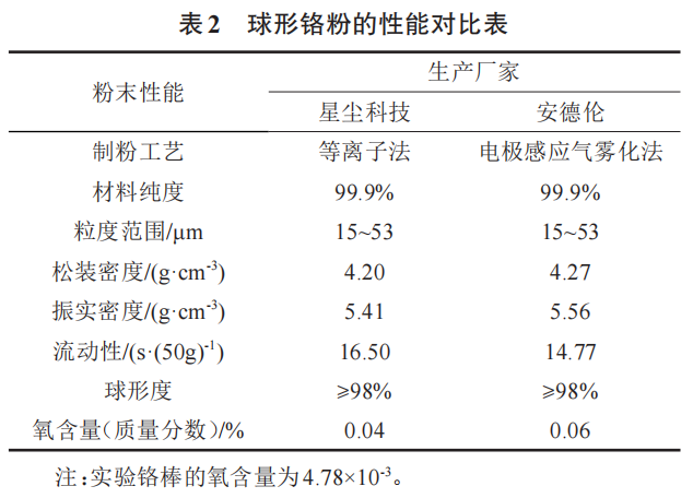 实验采用霍尔流速计对球形铬粉粉末流动性进行了测定,并与文献[9]的球形铬粉性能对比见表2,由表2可知,改进型电极感应气雾化制备球形铬粉性能不低于等离子法制备的球形铬粉。