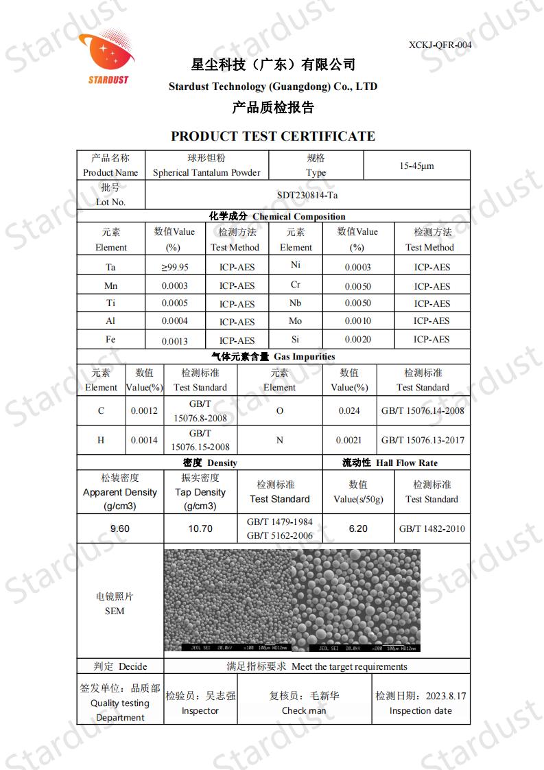 球形钽粉采用射频等离子体球化技术制备,具有高纯度、含氧量低、球形度高、表面光滑、无卫星、粒度分布均匀、流动性能优异、松装密度和振实密度高等特点。