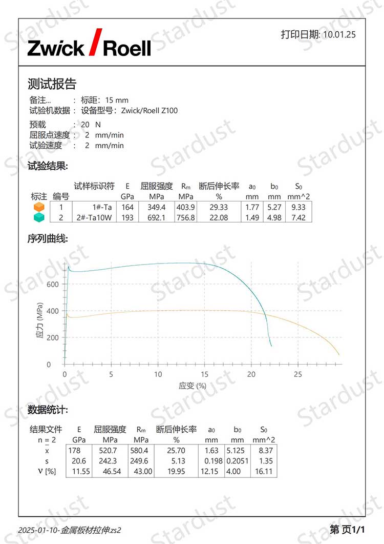 1.高熔点:钽(Ta)和钨(W)都是高熔点金属,Ta-10W合金的熔点高,适用于高温应用。