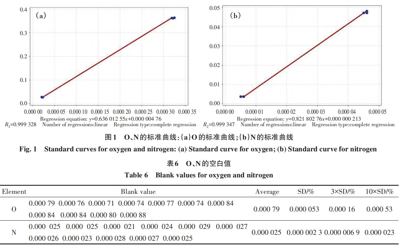 Additionally, the R² value for the O standard curve is 0.999328, and for the N standard curve, it is 0.999347, indicating good linearity. These standard curves are suitable for determining the O and N content in tantalum-tungsten alloys.