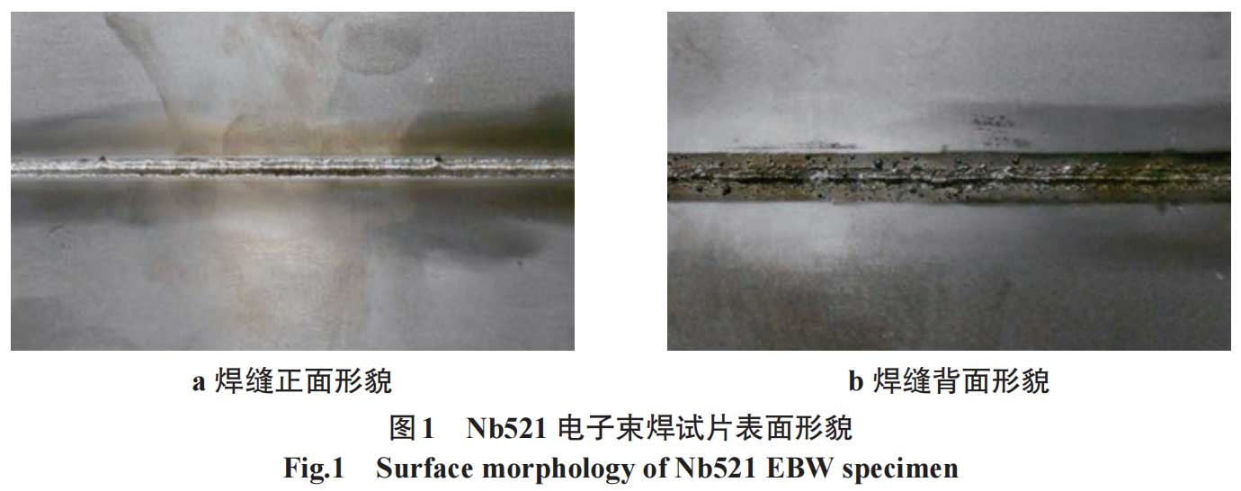 In order to avoid cracks and pores in Nb521 alloy electron beam welding, the following measures are taken: strengthen pre-welding cleaning, reduce heat input during welding by optimizing the matching of parameters such as electron beam current, acceleration voltage, welding speed, focusing current and working distance, control weld shape, reduce stress concentration, thereby achieving the purpose of refining weld structure and reducing welding stress, and finally eliminating pores and cracks. The rationality of the parameters is preliminarily judged by weld formation, and the main welding process parameters are shown in Table 2.